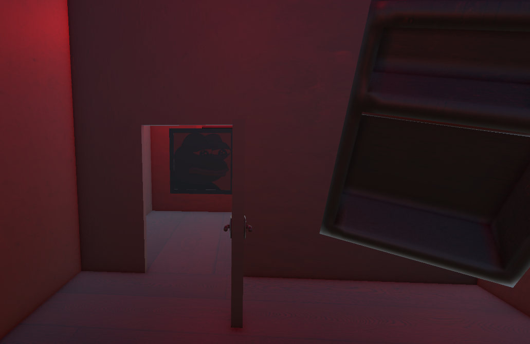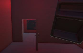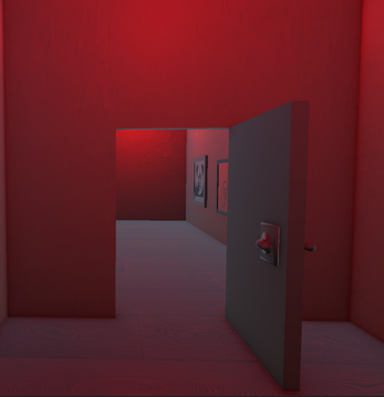 Cool use of a door and interesting change in lighting with the red lamp. This makes you question if you're in danger and need to escape.